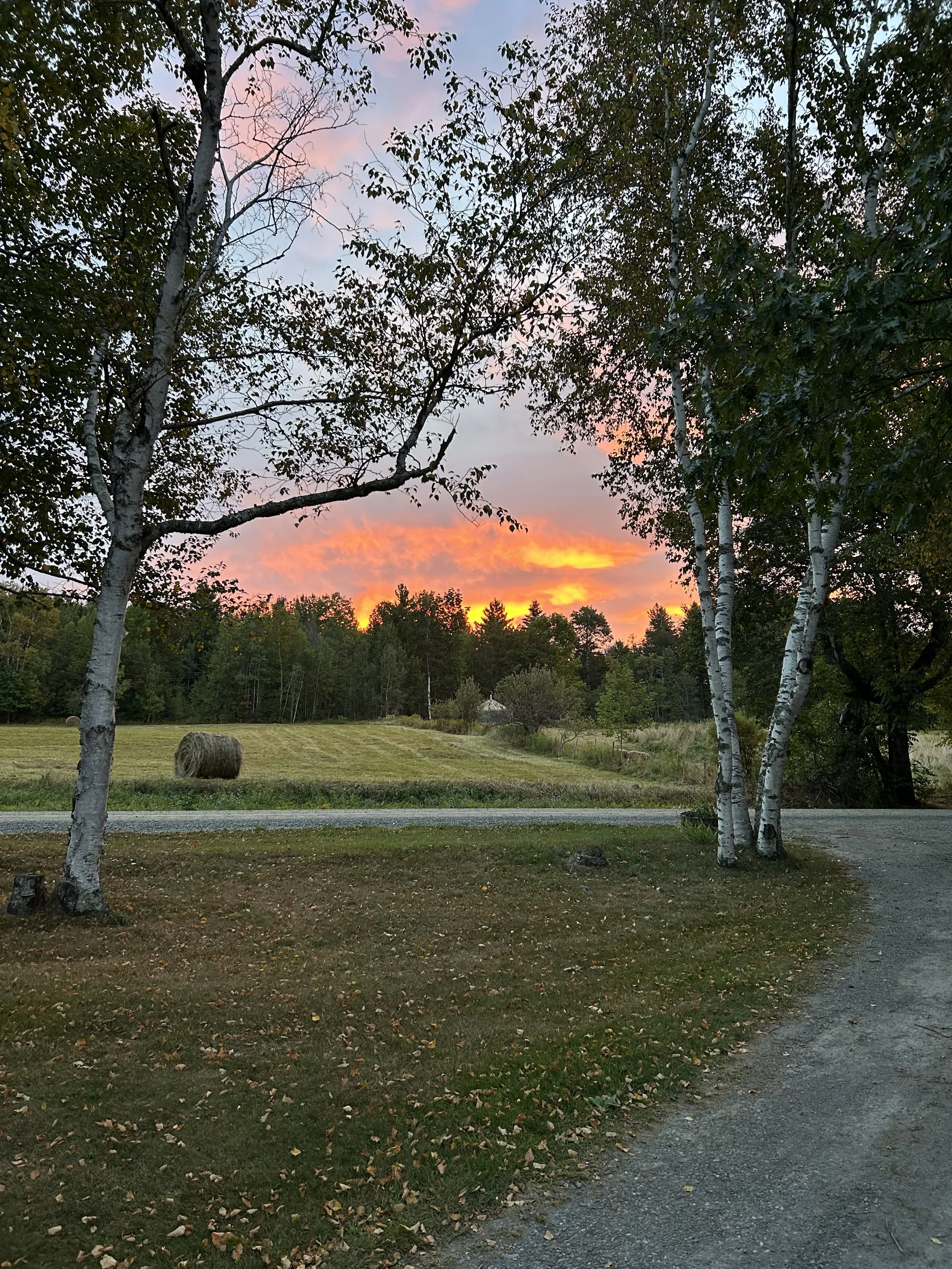 This is just a gorgeous sunrise here in this brave little state of Vermont. Captured where our driveway and the road meet, across the road from our neighbor’s freshly mown hayfield, it’s a reminder that there’s beauty in the darkest of days. Across the fence from the hayfield is our other neighbor’s yurt, a place that shelters a friend of theirs.
