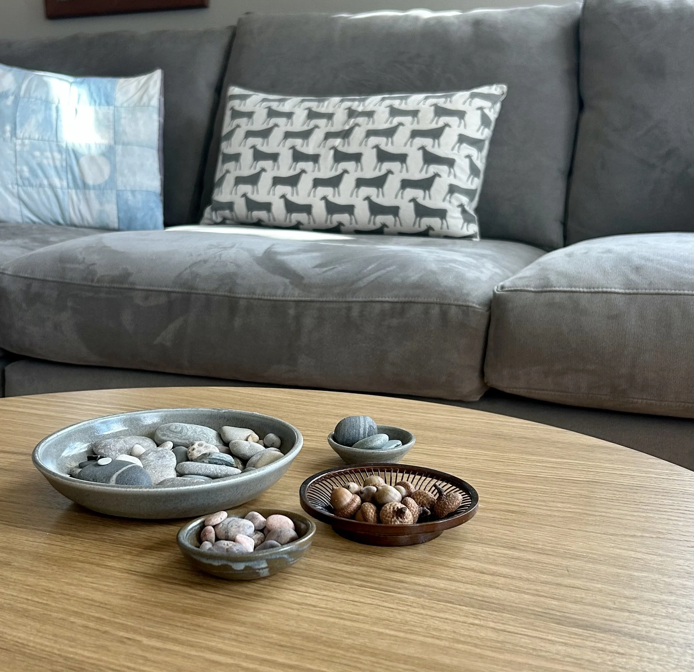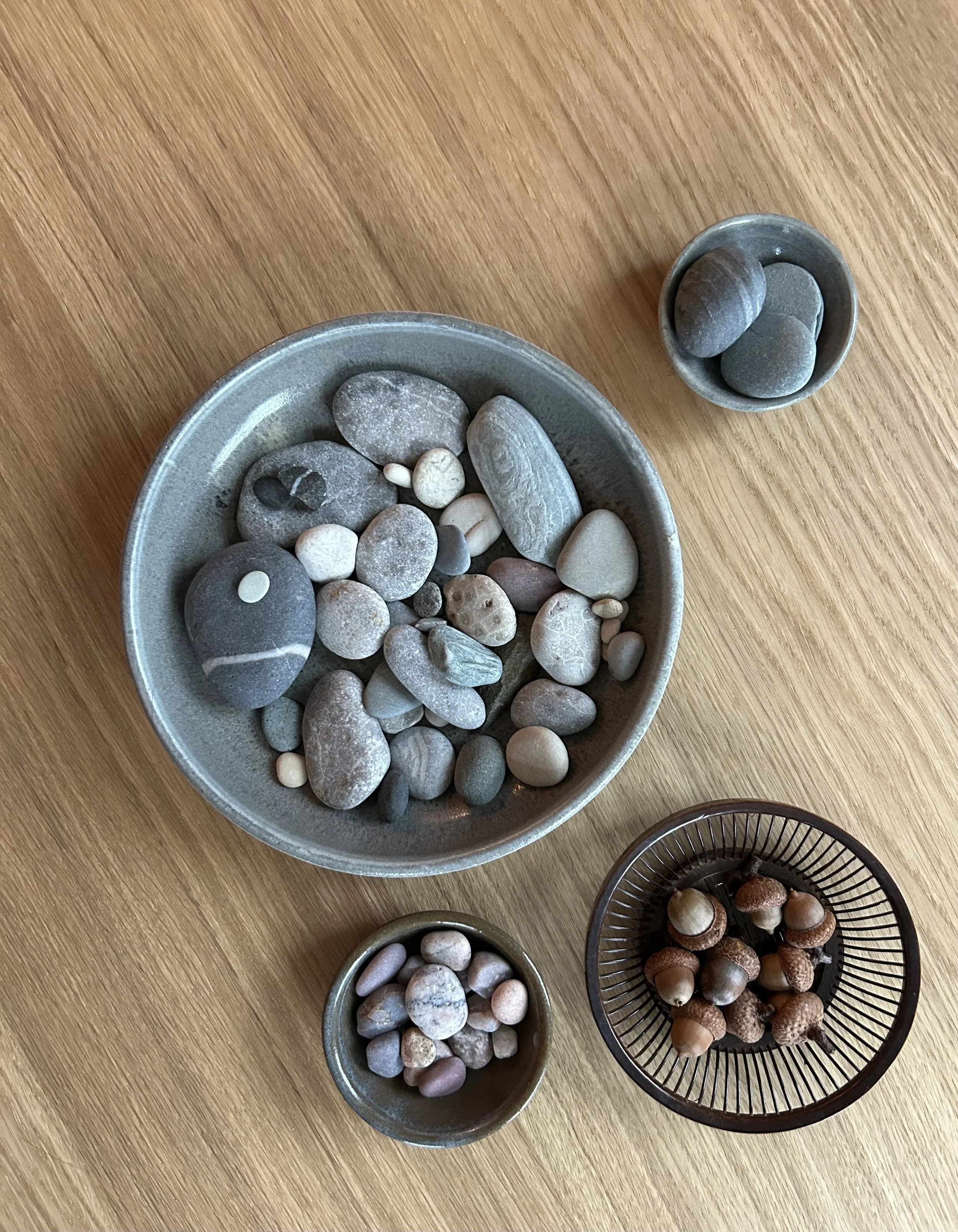 I’ve taken to creating quiet little spots around the house, where I can pause, breathe, recenter. Coming home from the “real world” and spotting our annual vase of sunflowers on the porch helps me transition into home-sweet-home mode. Holding a pebble in my hand brings me back to the present moment, where I can regain my composure. It works like a charm. I’m thinking maybe it is a charm.