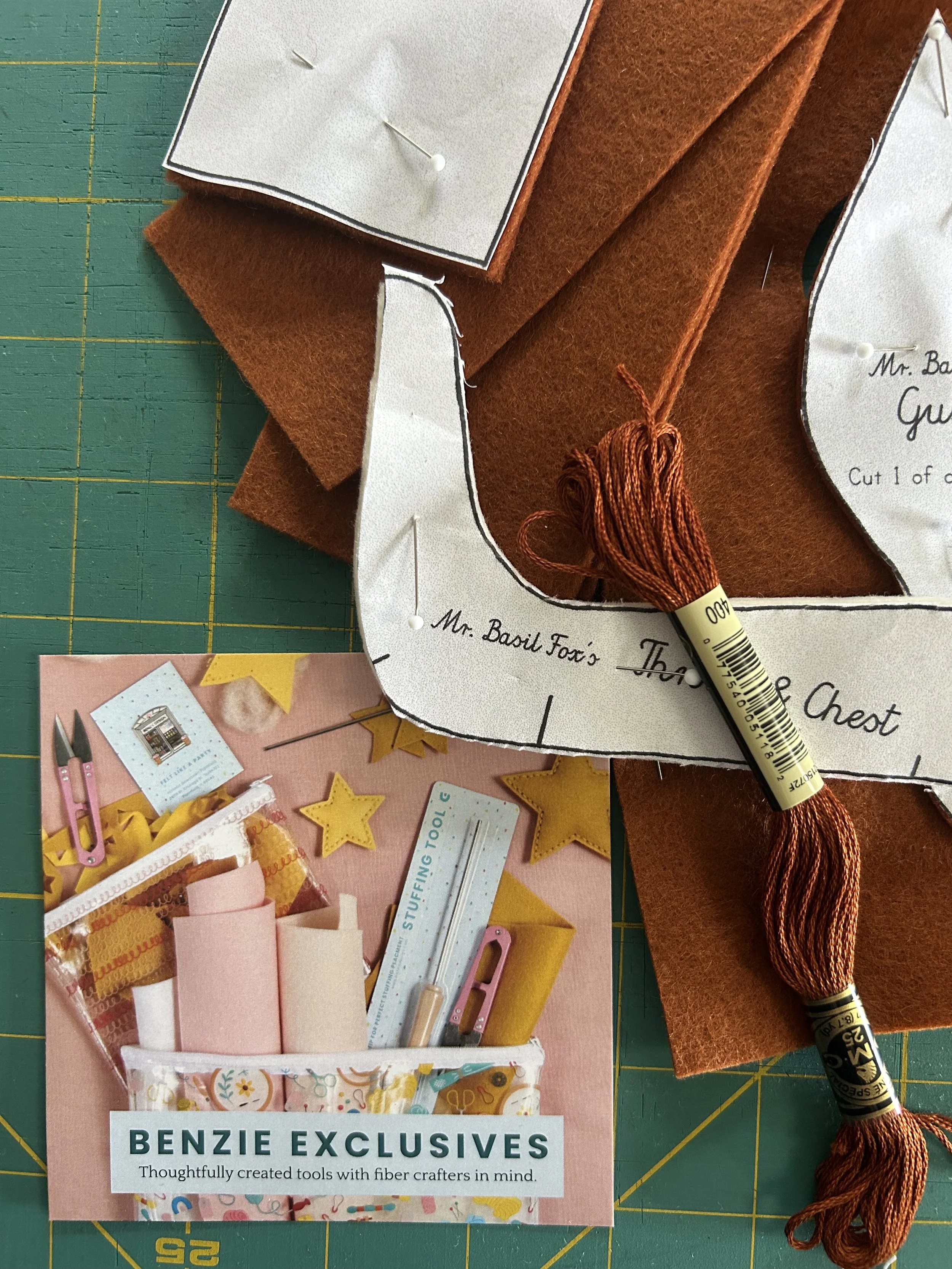 Working on another “softie”, using a pattern purchased from Alicia Paulson years ago, I ordered wool felt and a few other supplies from Benzie Design, based in Plainfield, Il. Their package arrived promptly and was a delight to open. I’m working full steam ahead on this fox, someone’s third birthday is coming up…
