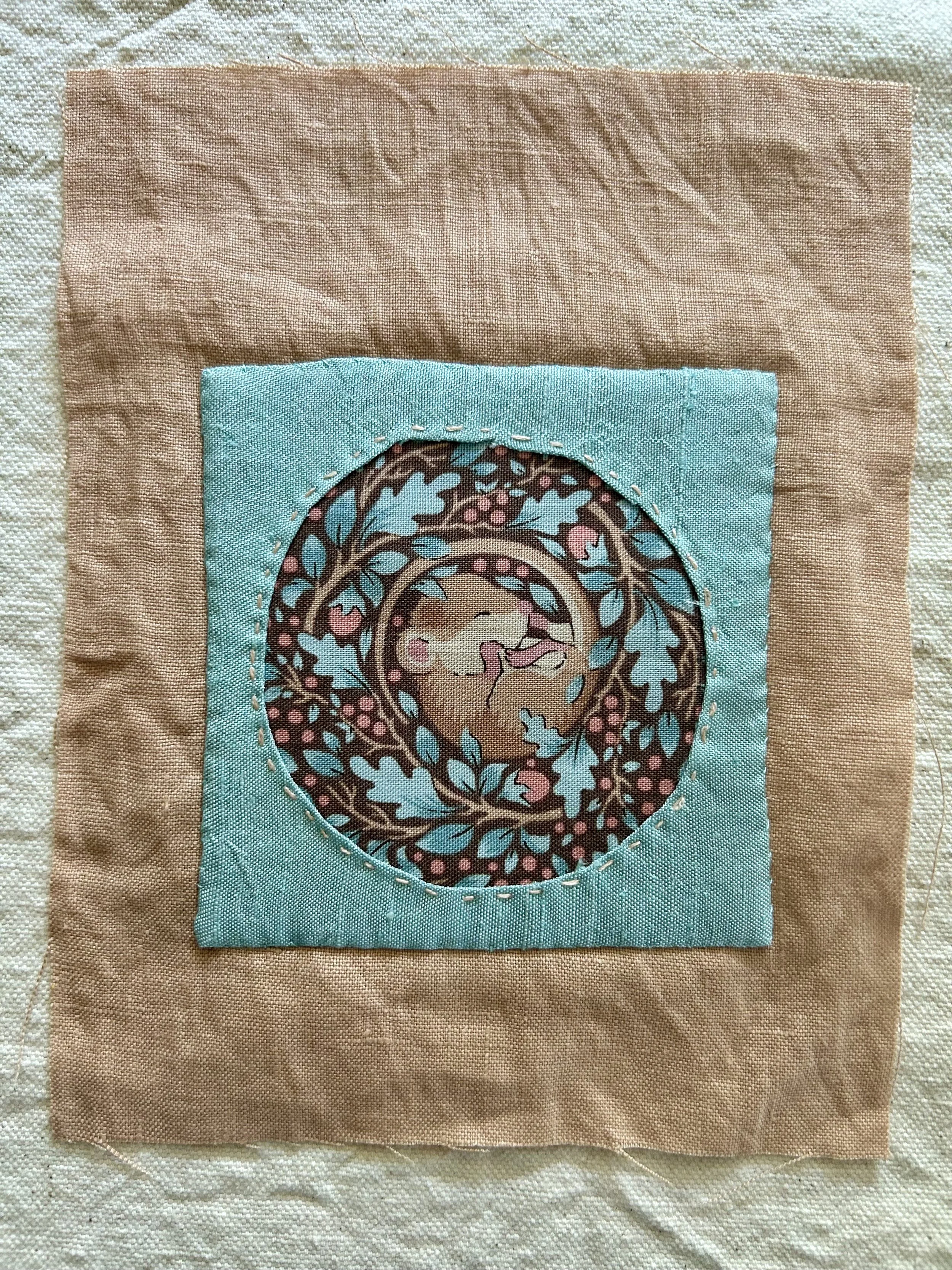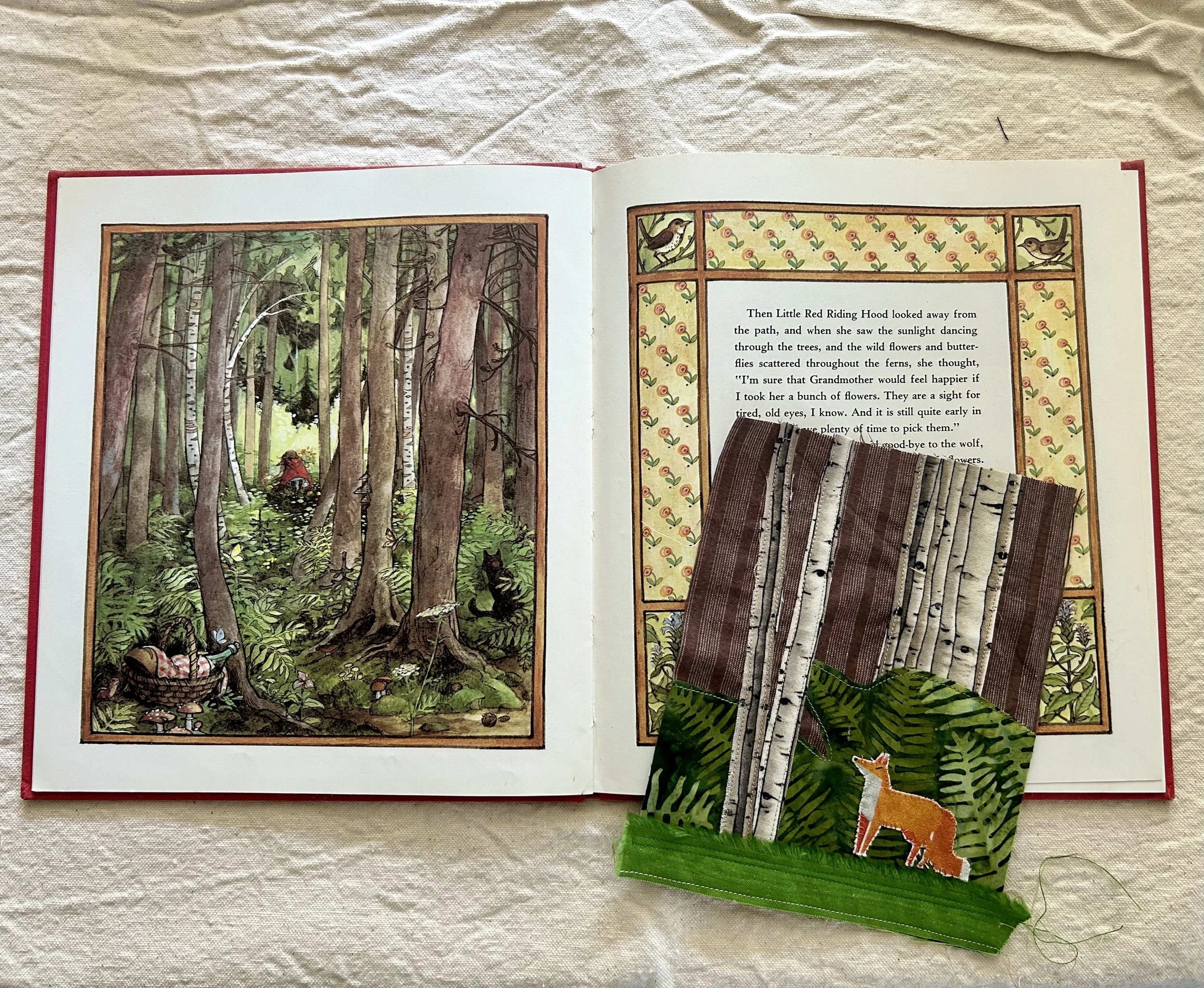 I also turn to children’s books for inspiration. Trina Schart Hyman’s Little Red Riding Hood is one of my all time faves, above. My Mumsie adores foxes, and so the first page I stitched for her book includes a scrap from this project which I sewed for our granddaughter Maggie during the pandemic.