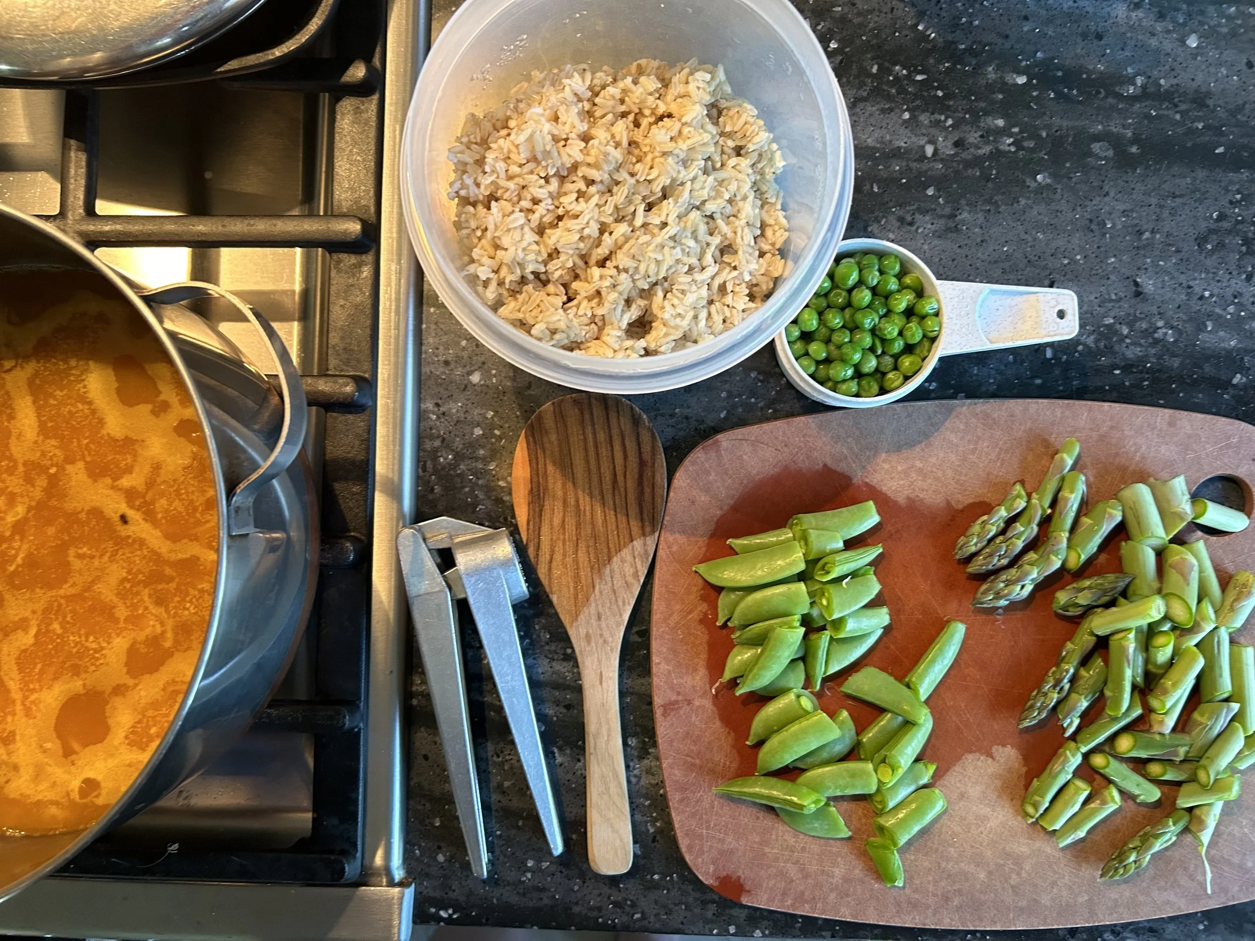 I bought asparagus and sugar snap peas at the farmers market on Saturday and made a pot of spring minestrone last night. I love Heidi Swanson’s book, Super Natural Cooking… she also writes the blog 101 Cookbooks. I remember years ago, bringing local ingredients home from VT in a cooler to our place in CT and making this same recipe. Batman and I sat out on the front door stoop, bowls in hand and longed for the days when we could be in VT full time. :-)