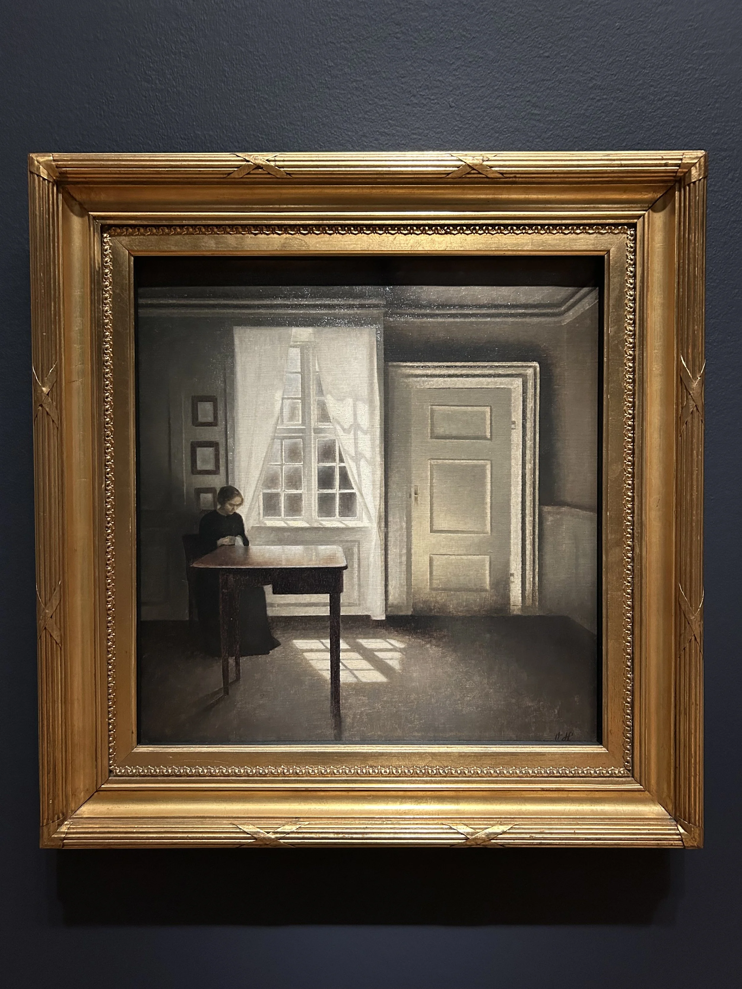Interior with a Lady, 1901. Oil on canvas by Danish artist Vilhelm Hammershøi, 1864-1916. We spent a morning with Hannah and Freya at the Detroit Institute of Arts while we were visiting for Thanksgiving. I came back to this luminous painting a few times. The light, the simplicity of the setting, and of course, the woman with a needle and thread in her hands captivated me.