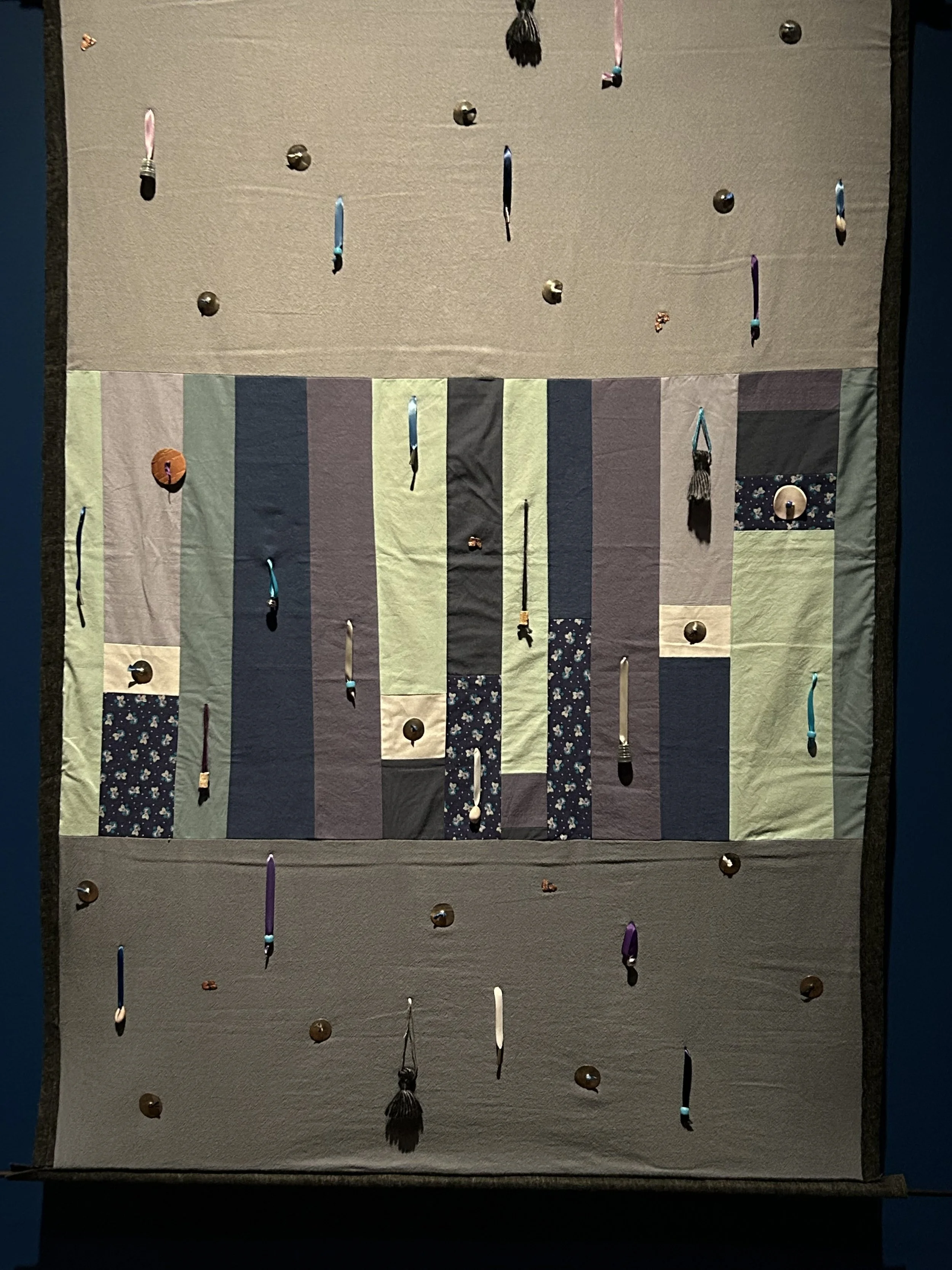 This piece was made with hand-dyed linen and cotton, wool, flattened US quarters, cones, thimbles, glass beads, float copper, cowrie and conch shells, fossils, birchbark, wool yarn, polyester ribbon, and artificial sinew, by Jason Wesaw (born 1974) Pokagon Band of Potawatomi. As I stood in front of it, I could almost feel the stitching that went into it.