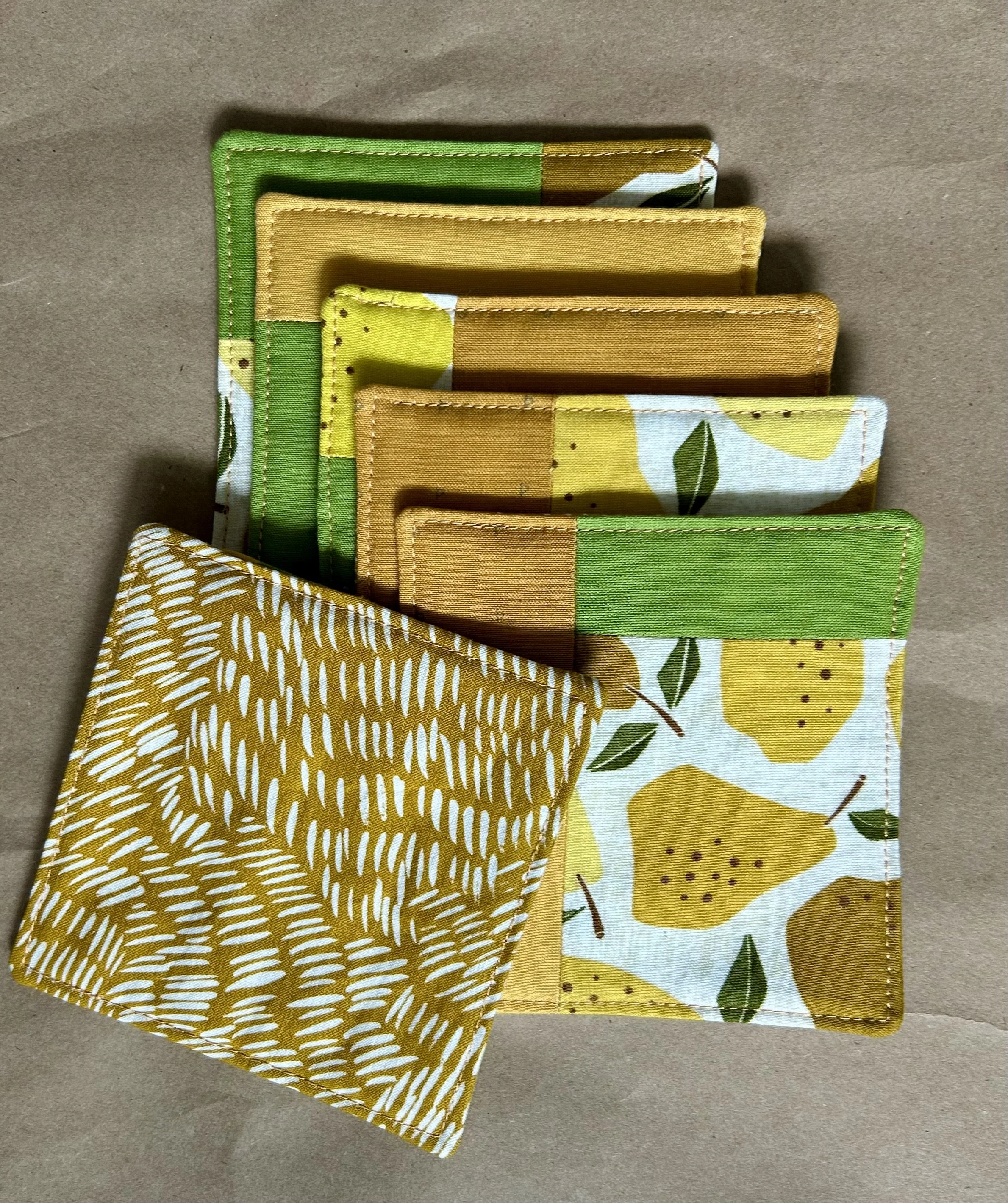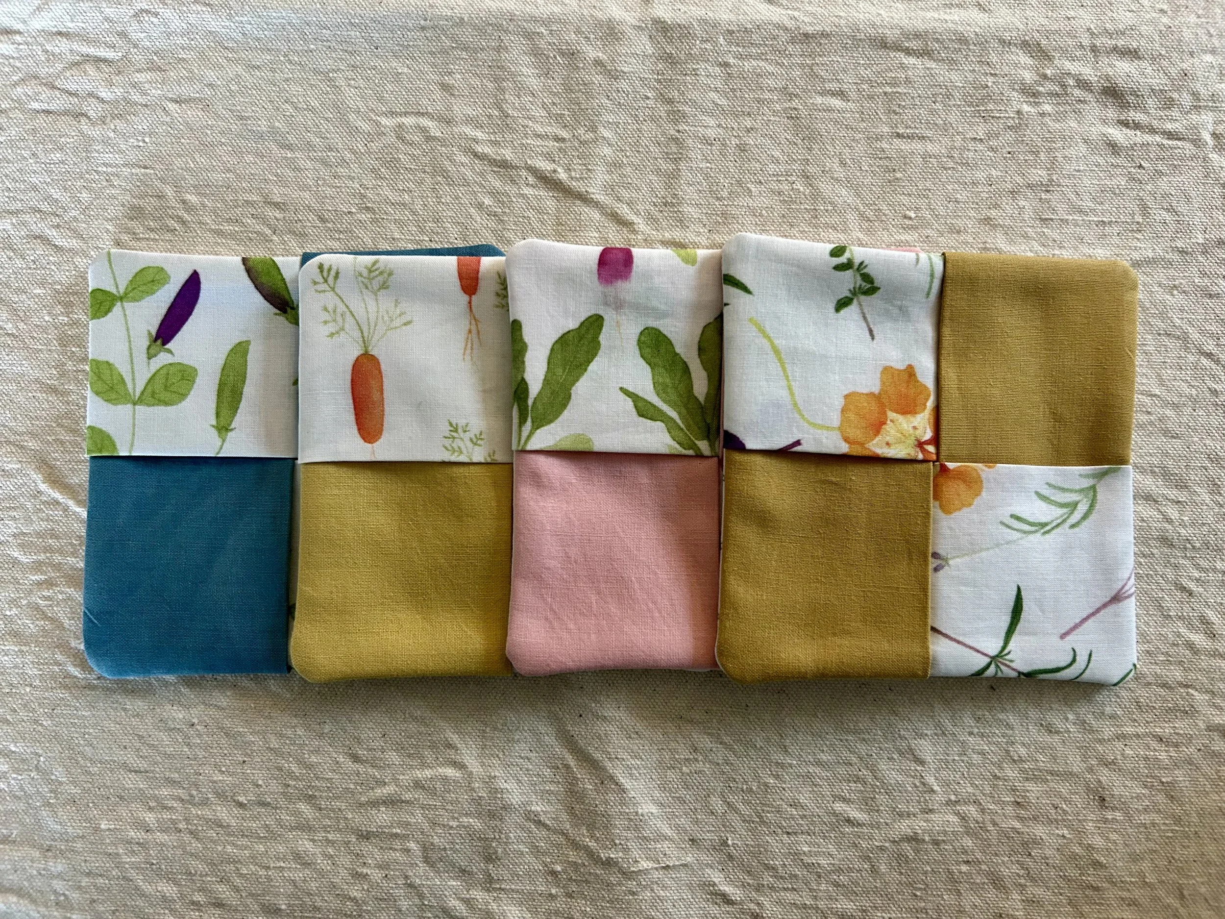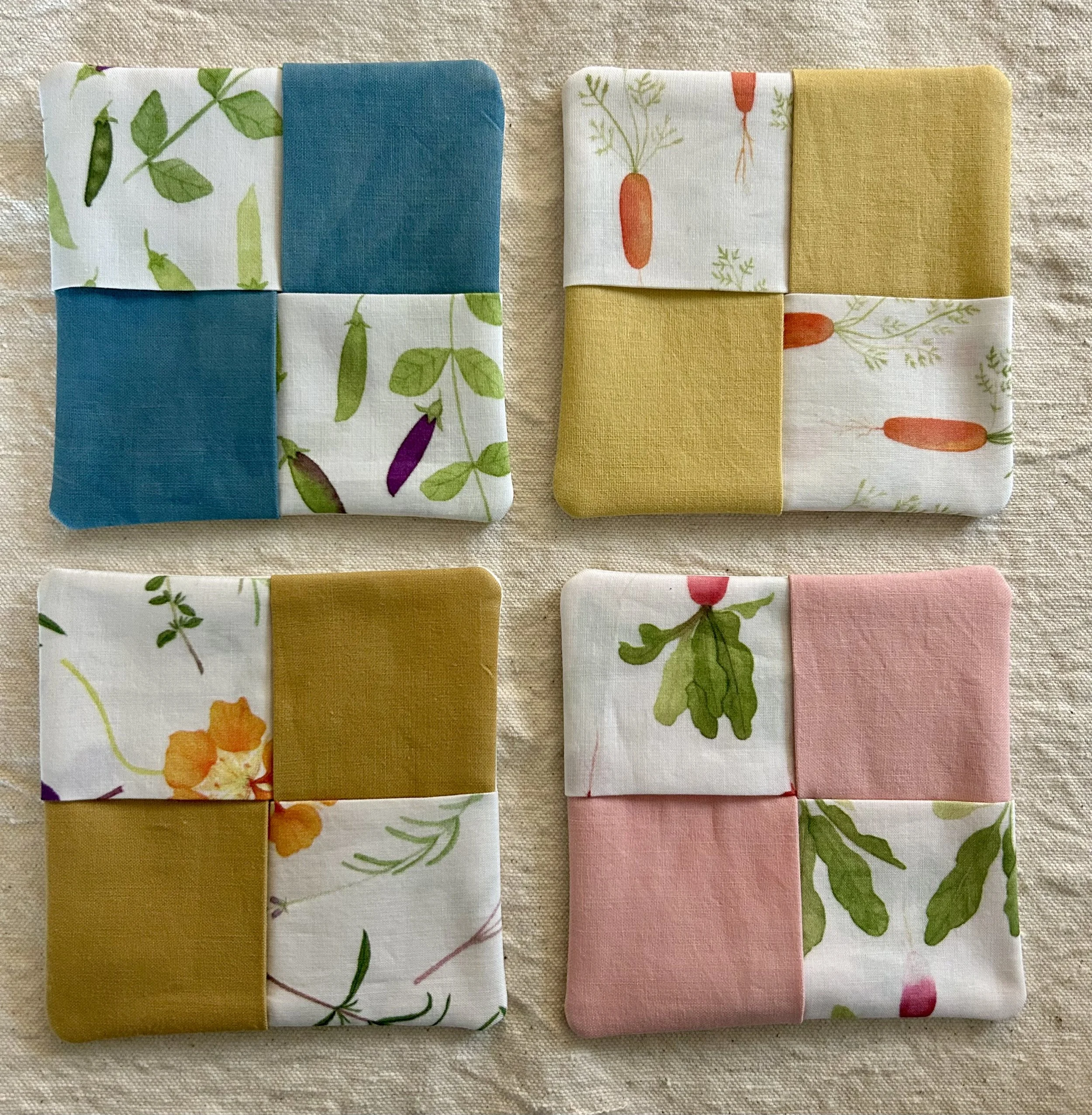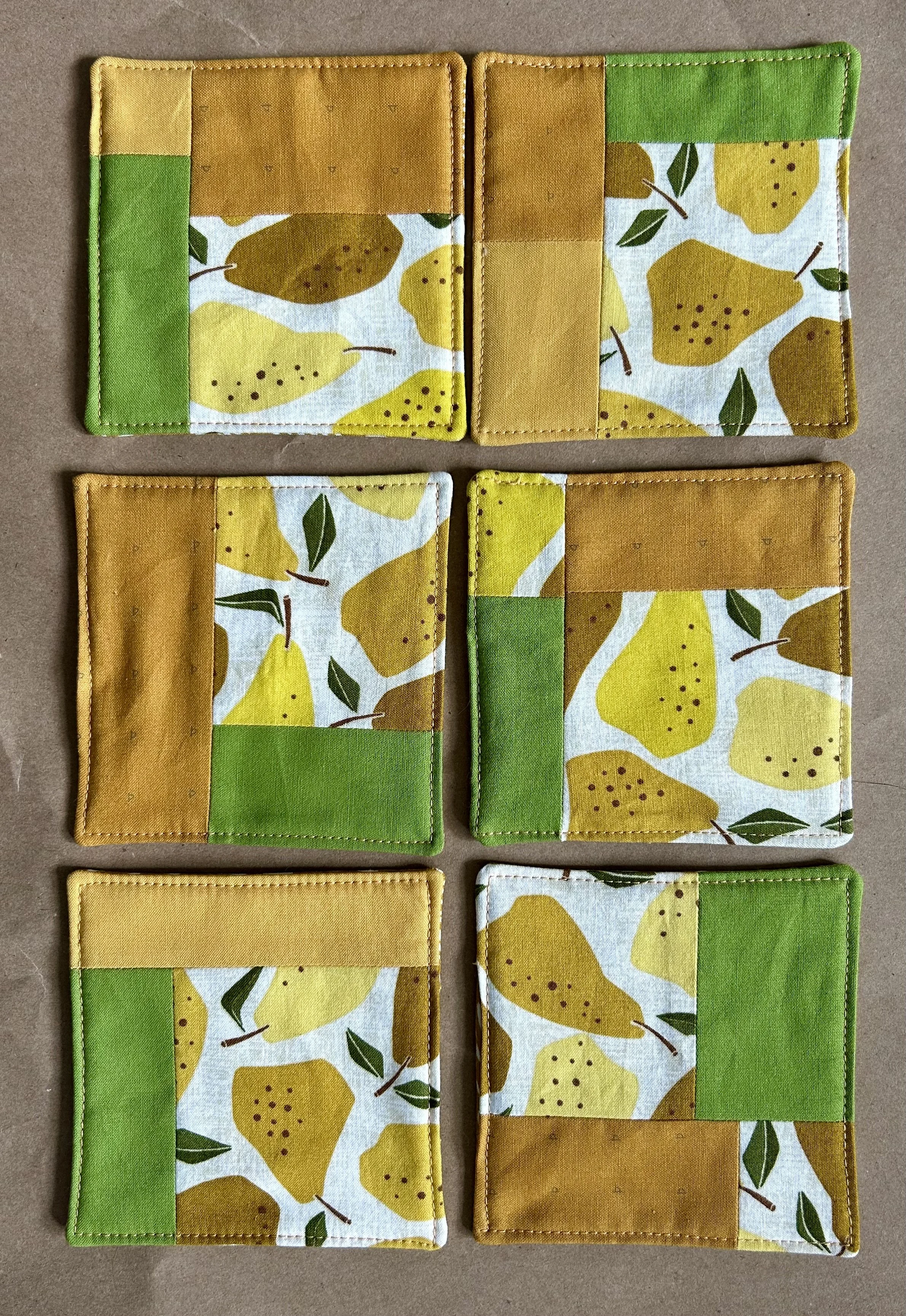 A while back, I made some napkins with this “quince” fabric as a housewarming gift for some friends. I used the scraps from that project to make some coasters for my friend Dolo’s birthday. I like to imagine the coasters, snug under a mug of coffee, way out in the S.F. Bay area.