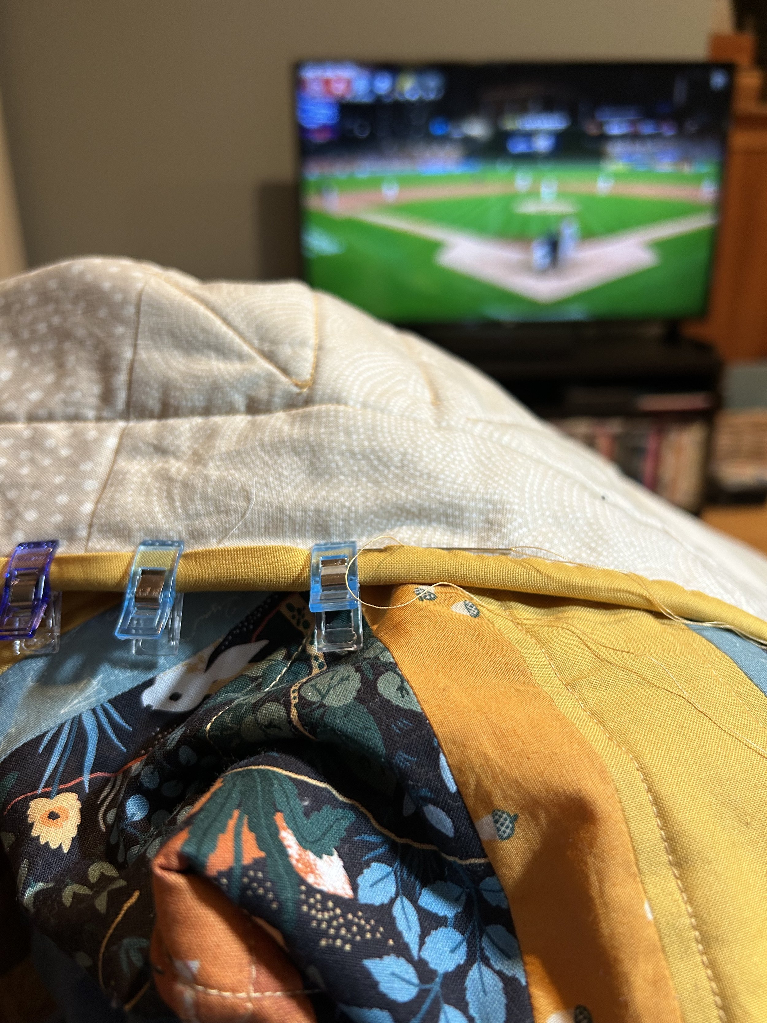 Binding the quilt while watching the Tigers with Batman.